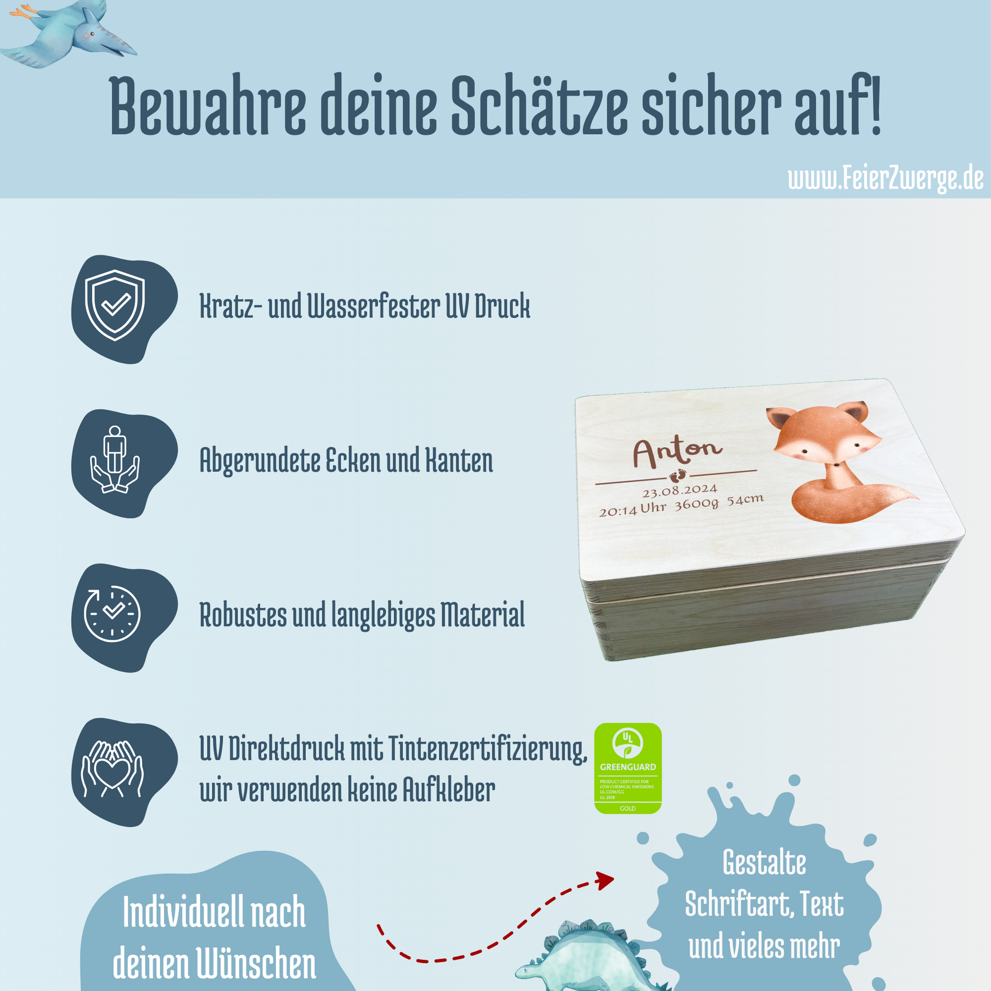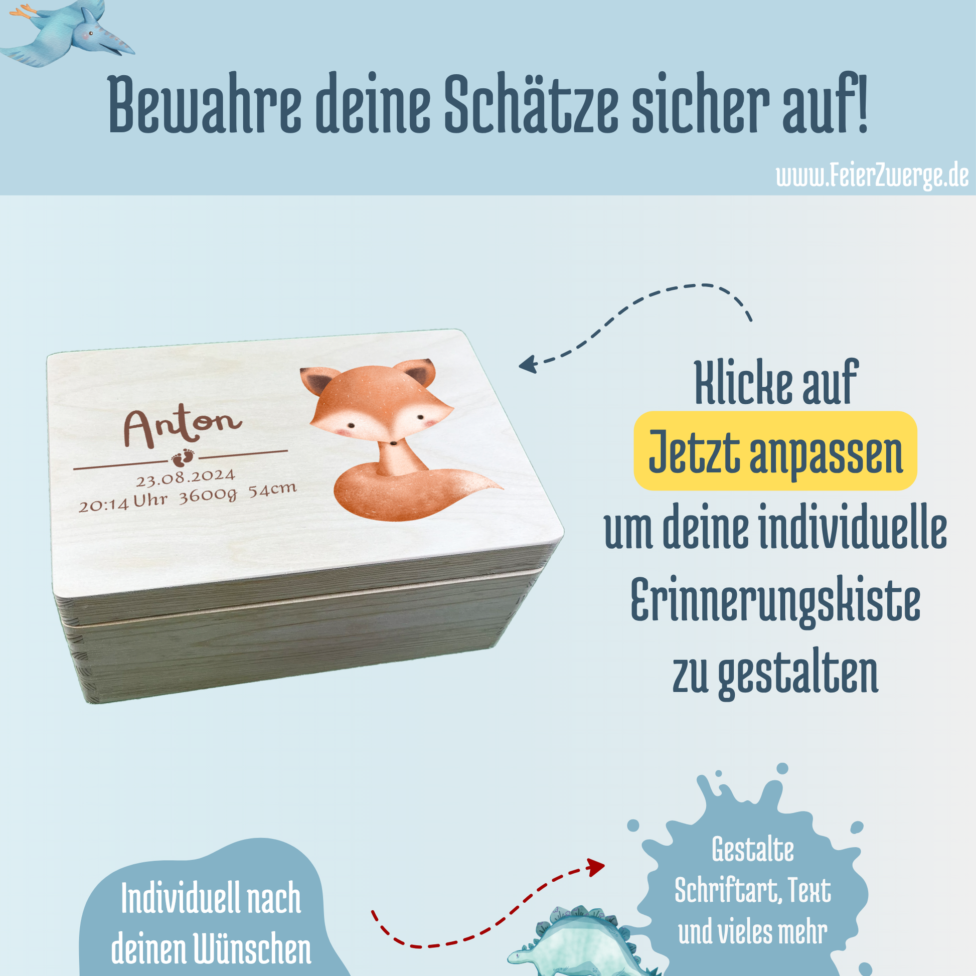 - Durch unsere Personalisierungsmöglichkeiten kannst du deiner Aufbewahrungsbox einen einzigartigen Style verpassen. Nutze hierfür einfach das Personalisierungsfeld und gebe z.B. Namen, Geburtsdatum, oder andere Daten ein