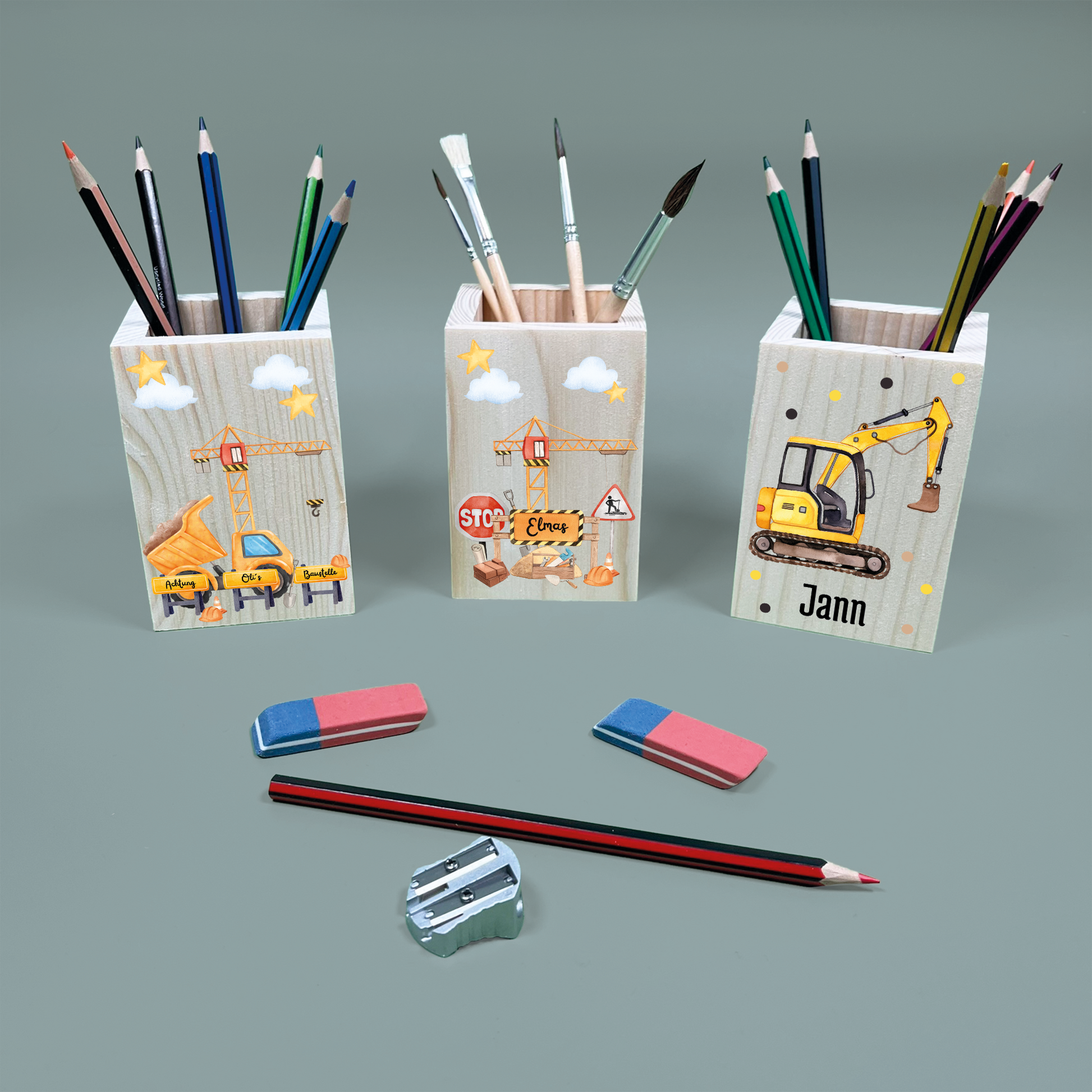 Der Stiftehalter wird aus stabilem Holz gefertigt und hält dem turbulenten Alltag am Kinderschreibtisch mühelos stand.