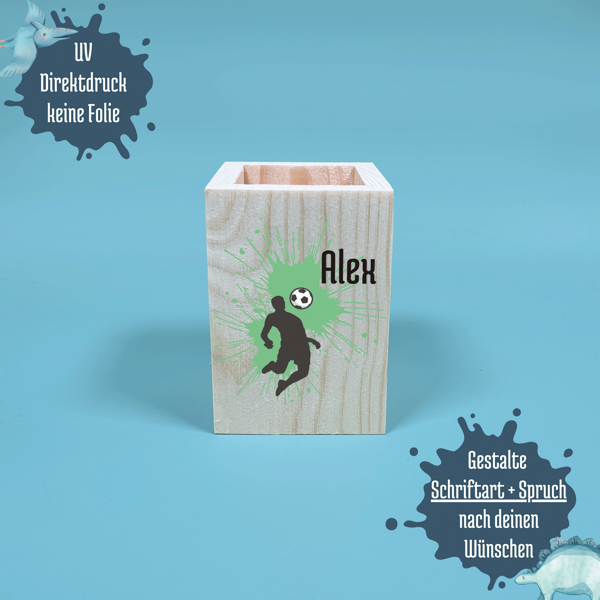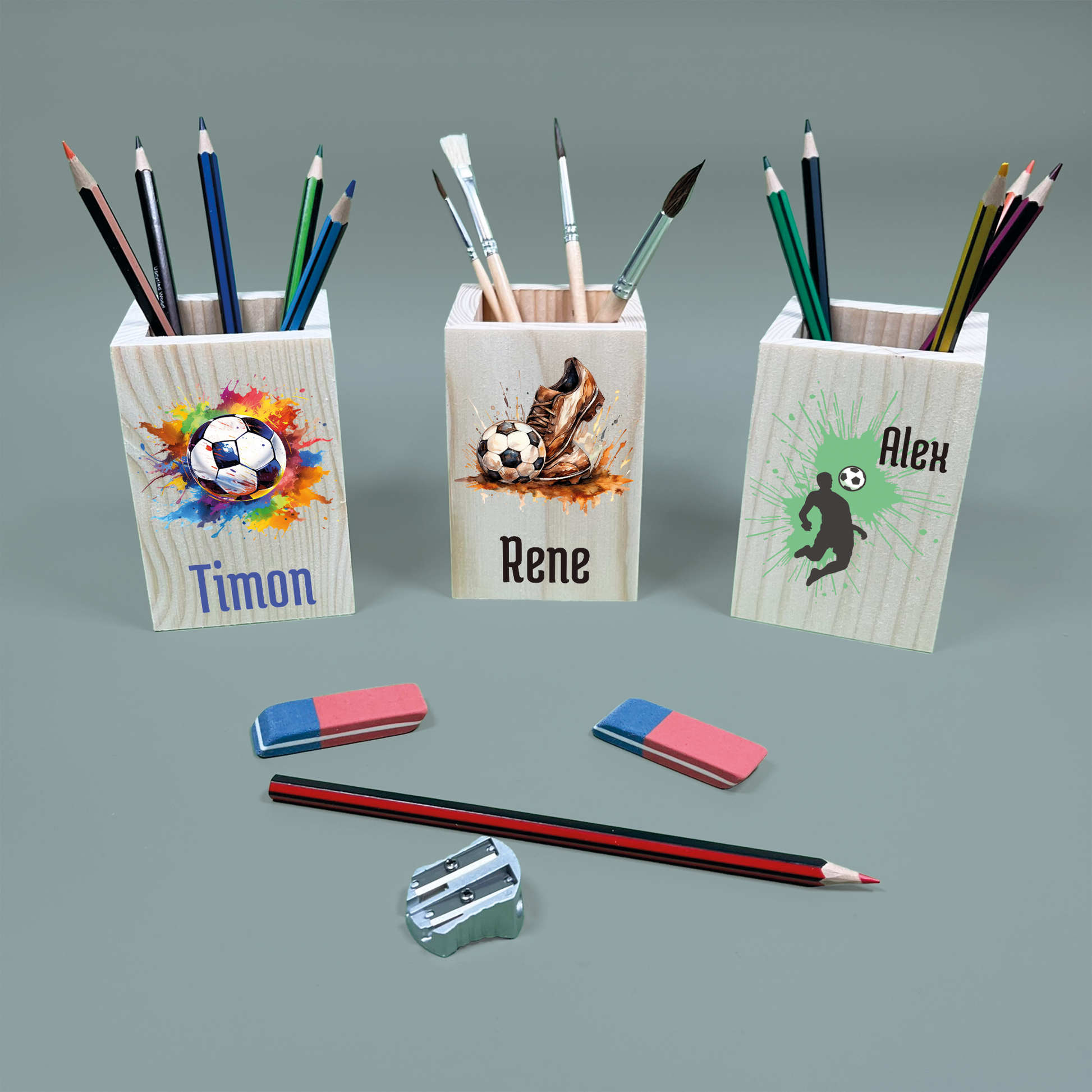 Der Stiftehalter wird aus stabilem Holz gefertigt und hält dem turbulenten Alltag am Kinderschreibtisch mühelos stand.