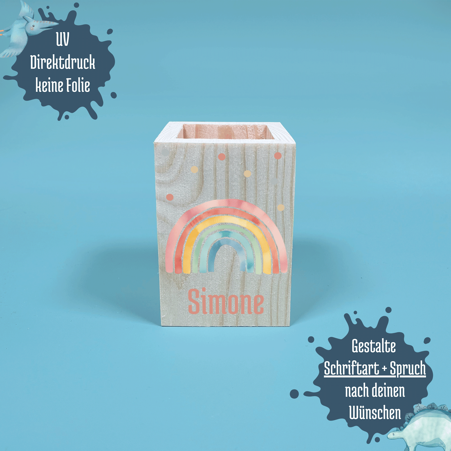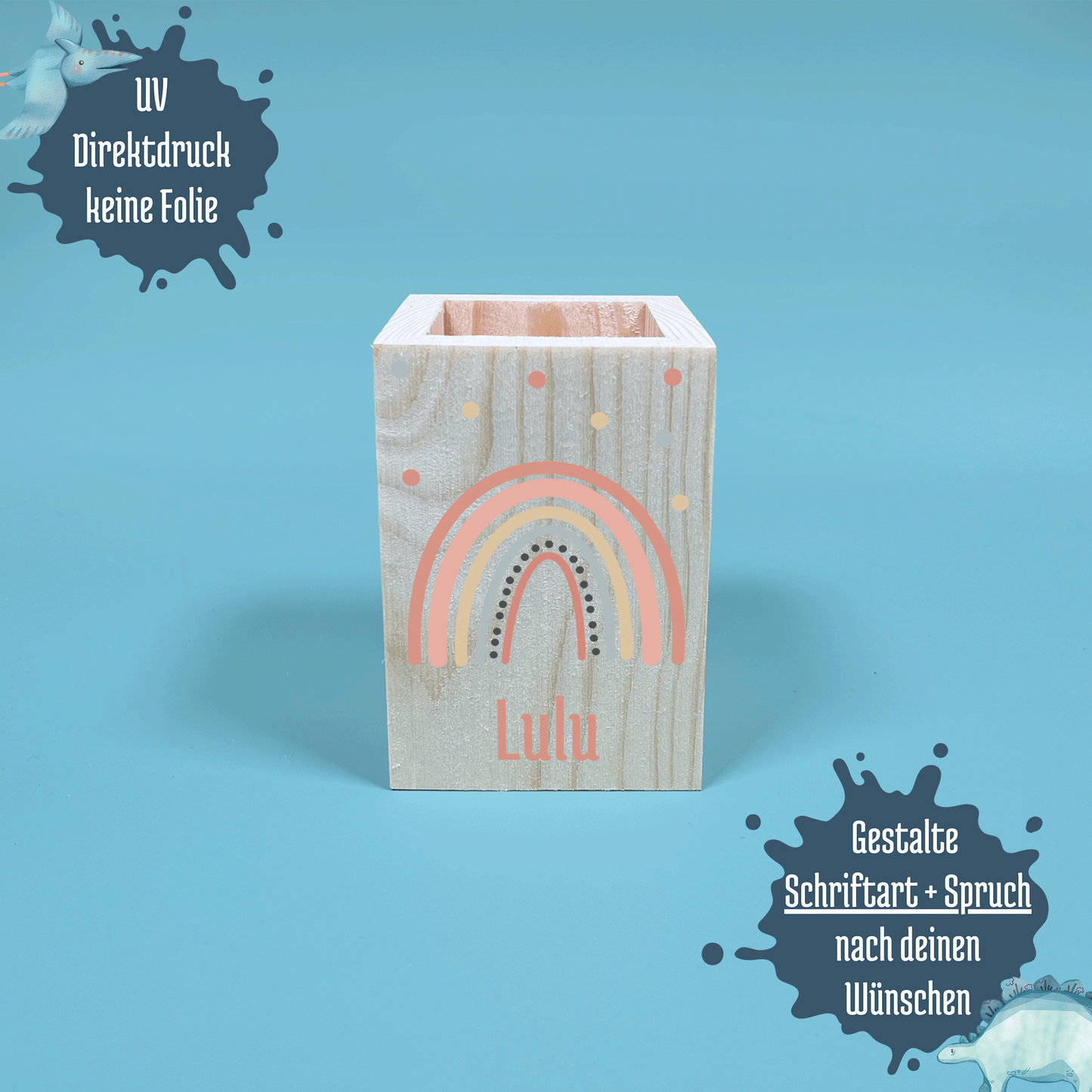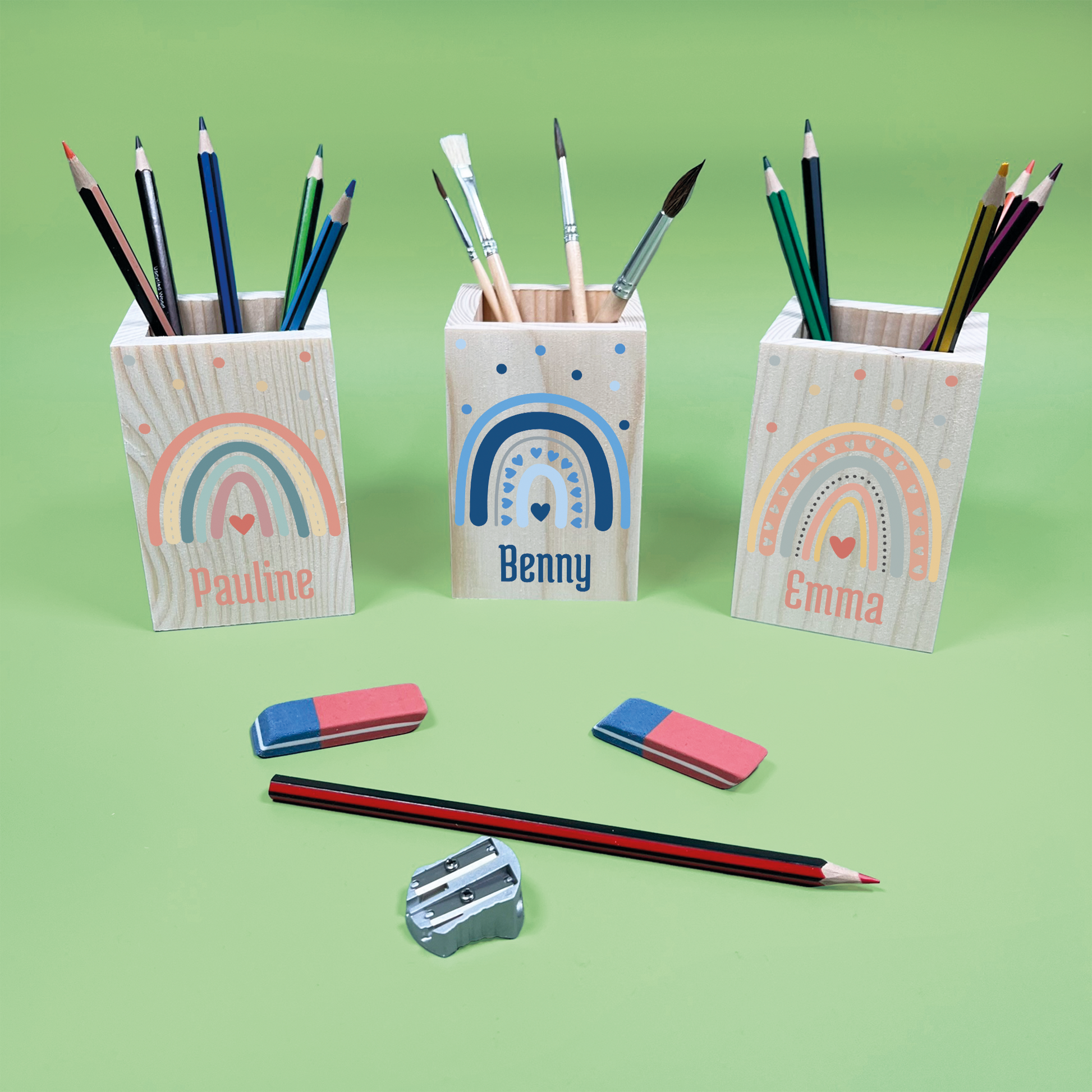 Der Stiftehalter wird aus stabilem Holz gefertigt und hält dem turbulenten Alltag am Kinderschreibtisch mühelos stand.