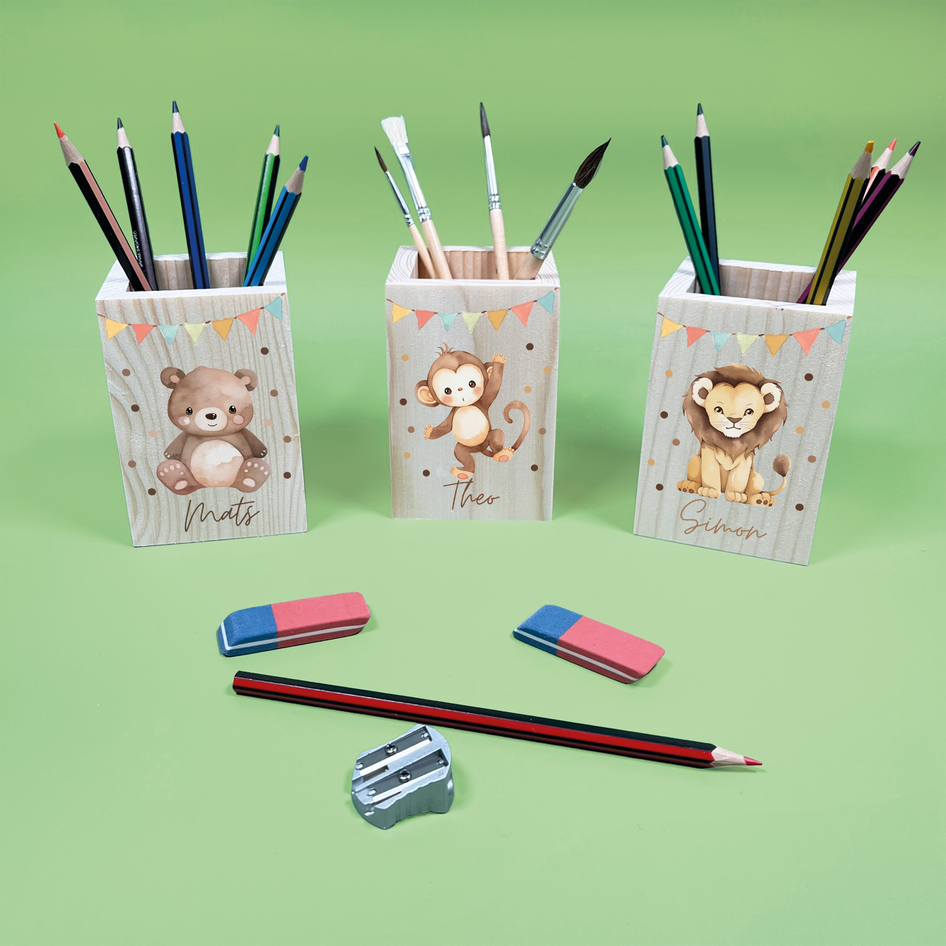 Der Stiftehalter wird aus stabilem Holz gefertigt und hĂ€lt dem turbulenten Alltag am Kinderschreibtisch mĂŒhelos stand.