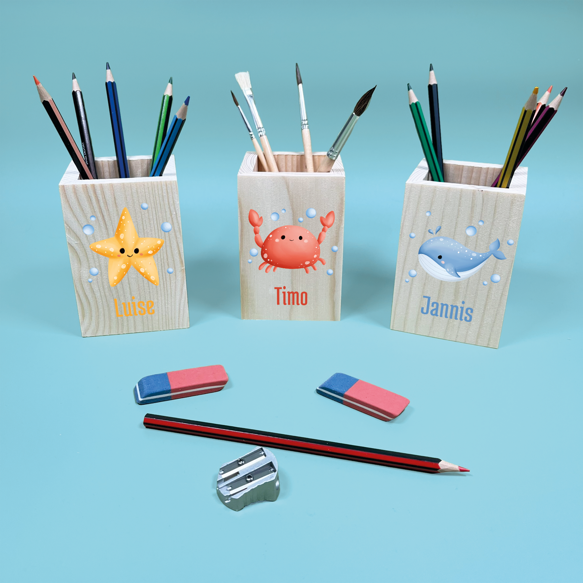 Der Stiftehalter wird aus stabilem Holz gefertigt und hält dem turbulenten Alltag am Kinderschreibtisch mühelos stand.